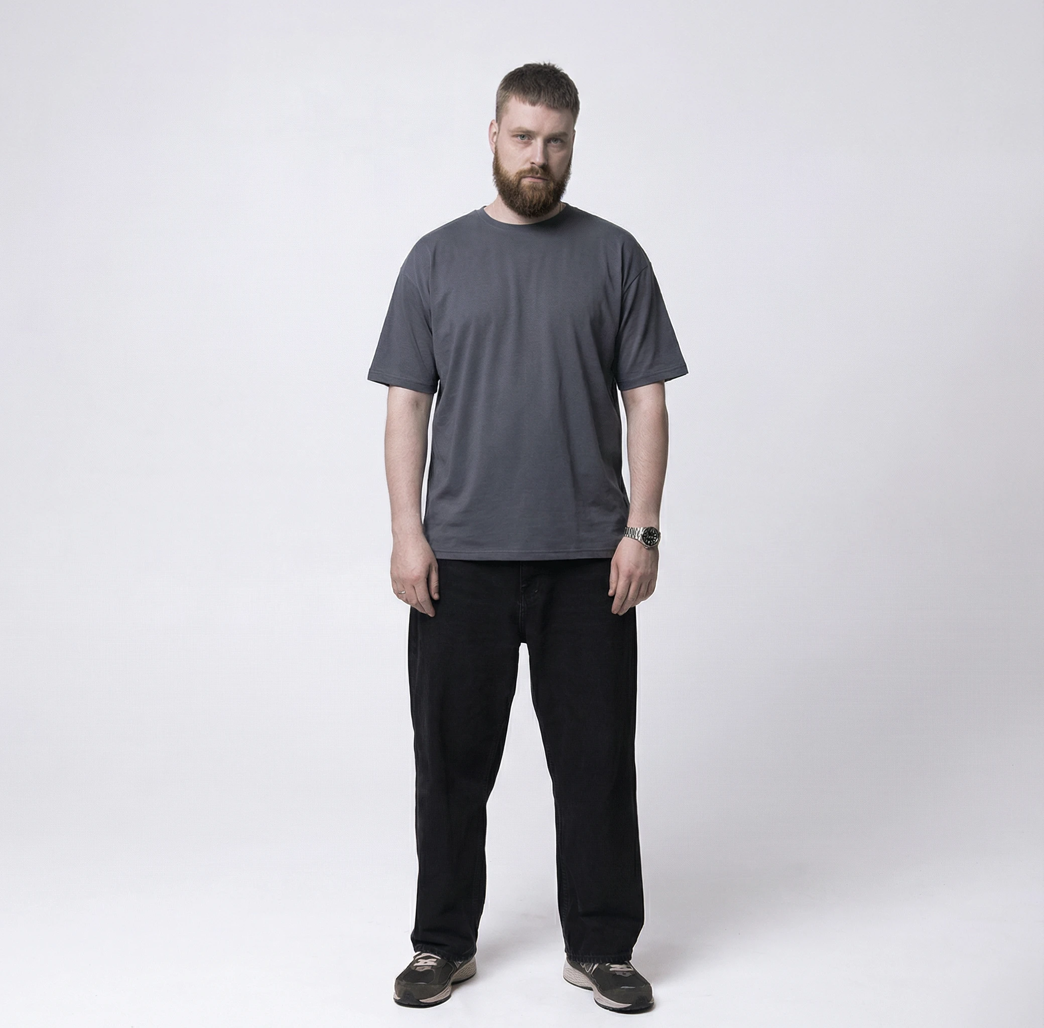 Оверсайз-посадка предполагает более свободный силуэт. Если хотите максимально «просторный» образ — выбирайте размер по привычному; если предпочитаете чуть более собранную посадку — ориентируйтесь на ширину по груди и при необходимости берите на размер меньше.